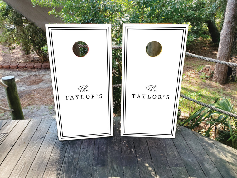 Elevate your setup with these Custom Minimalist Surname Cornhole Wraps, designed with a sleek black-and-white palette and a refined double-line border. Featuring elegant script paired with modern serif lettering, this design highlights your family name in a clean, timeless layout. Perfect for weddings, housewarming gifts, family events, or anyone who loves a simple, classic aesthetic.